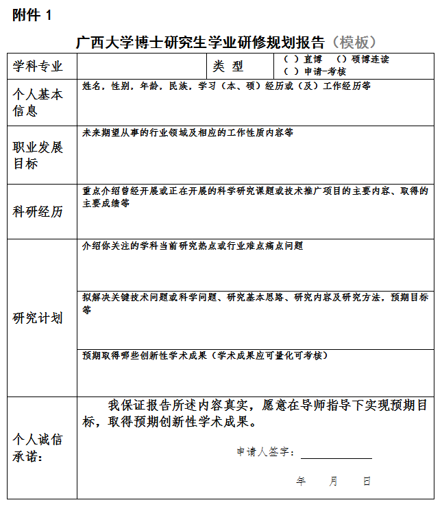 (八)申请直博生需提交所报考博士生导师的推荐书一份,可在我校研究生院网站下载专区下载《广西大学报考攻读博士学位研究生专家推荐书》填写并加盖报考导师所在单位公章,未加盖公章的推荐书无效。复试时须提交1份本人签字的《广西大学博士研究生学业研修规划报告》(简称《报告》,模板见附件1)。