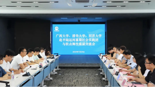 7月26日,我院团委联合广西大学海洋学院、清华大学、同济大学组建的“青春赋能世纪通途,匠心筑梦向海新程”暑期社会实践团,赴平陆运河与我院驻点师生开展座谈交流。学院党委书记陈立华、党委副书记银宁、副院长郭晓、团委书记潘桂祯、团委副书记陆源,以及驻点师生代表、实践团30余名成员共同参会,围绕运河建设、技术创新、青年担当展开深入交流。