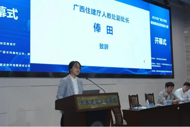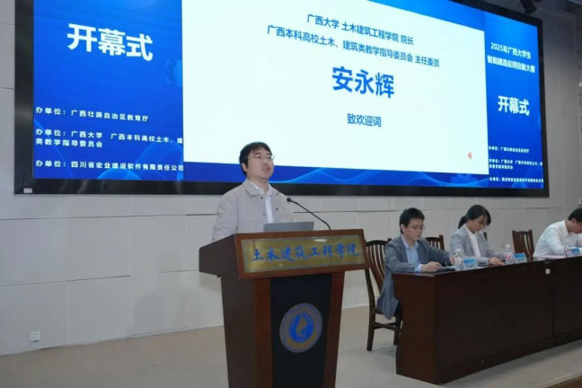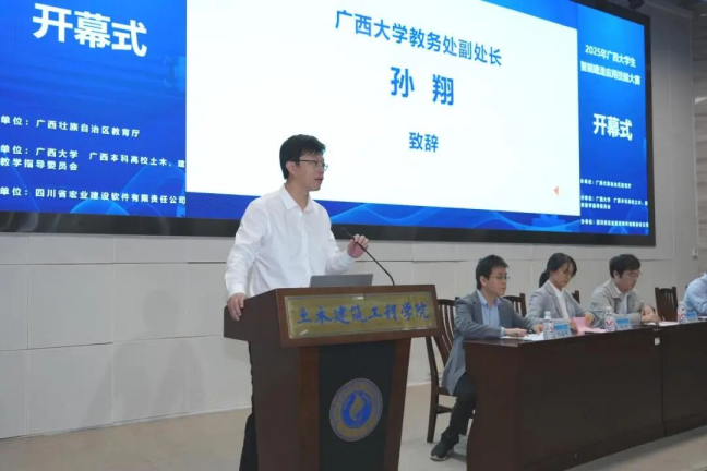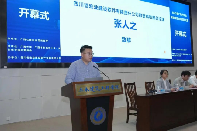 广西住建厅人教处副处长俸田、广西大学教务处副处长孙翔、万象城院长安永辉及四川省宏业建设软件有限责任公司数智高校部总经理张人之先后致辞。