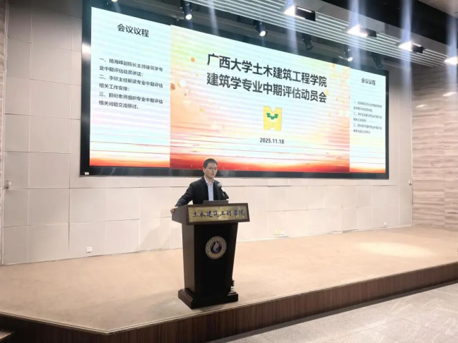 为全面落实专业建设要求,扎实推进建筑学专业中期评估筹备工作,明确评估任务、凝聚师生共识,2025年11月18日下午,学院建筑学专业中期评估动员会在第六报告厅顺利举行。学院分管教学副院长杨海峰、教学改革与专业建设部部长肖良、建筑规划系主任李欣,建筑规划系全体教师、建筑学专业班级辅导员及2021级至2025级建筑学专业全体本科生齐聚一堂,共同为建筑学专业高质量通过中期评估凝心聚力、共话发展。